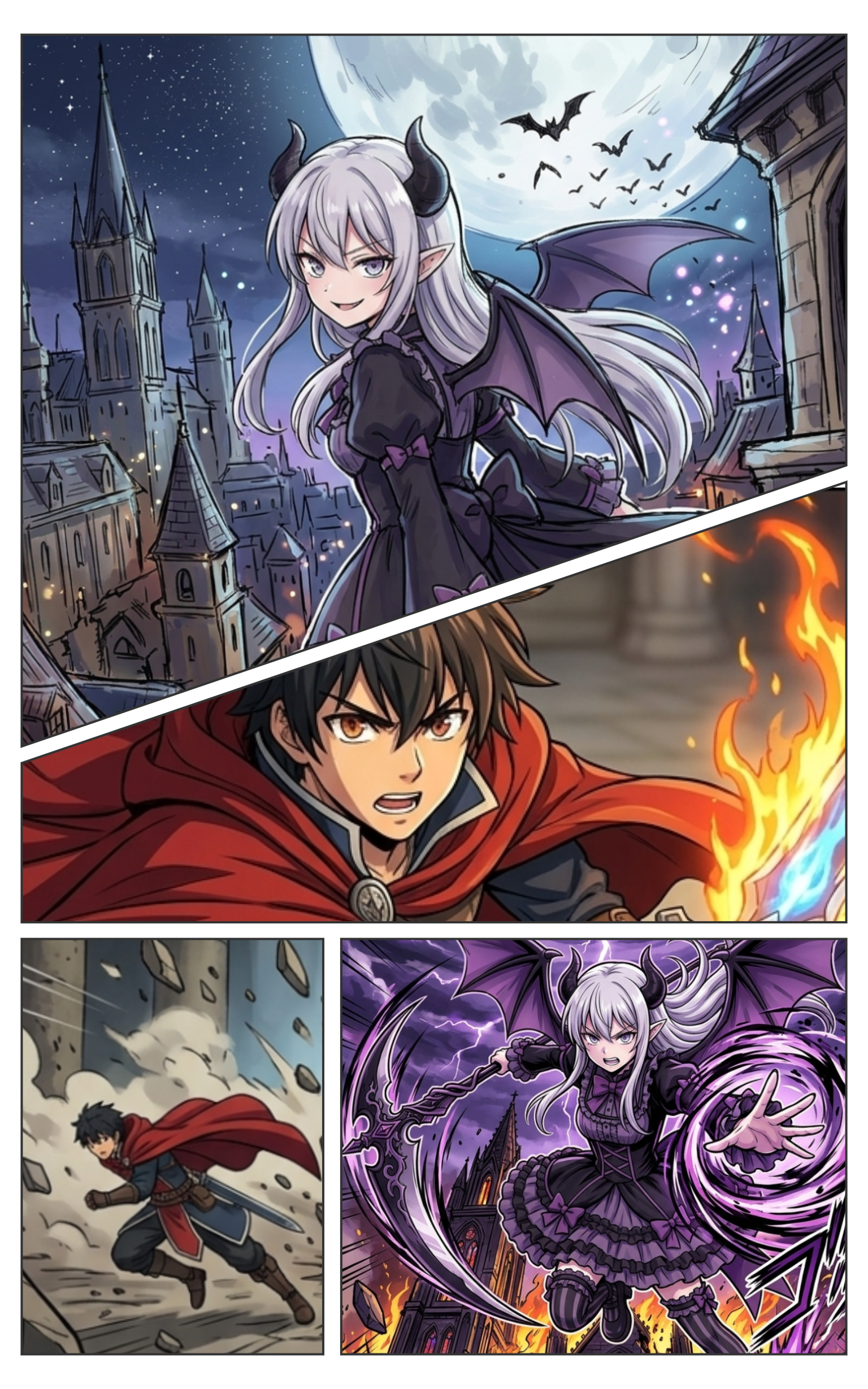 キャラクターや爆発がコマ枠を突き破って隣のコマへ飛び出す「ブチ抜き」演出。生成した画像をレイヤーとしてページ全体に重ね、コマの境界を自由に横断させられます。
